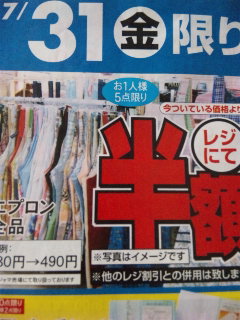 サミット衣料館コルモピアコピオ城山店にて、エプロン全品今ついてる価格よりレジにて半額!!