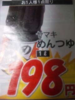 今日のお買い得☆神奈川県相模原版 ヤマキめ んつゆ 1㍑ 198円。 Produced by No Name Ninja SEO対策テンプレート