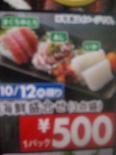 今日のお買い得☆神奈川県相模原版 海鮮盛り合わせ(3 点盛) 1 パック 500 円!! Produced by No Name Ninja SEO対策テンプレート