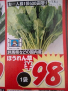 今日のお買い得☆神奈川県相模原版 群馬県などの国内産ほうれん草 1 袋 98円!! Produced by No Name Ninja SEO対策テンプレート