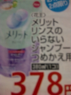 スーパーアルプス城山店にて、<花王> メリット リンスのいらないシャンプーつめかえ用 380ml(1コ) 378円!!