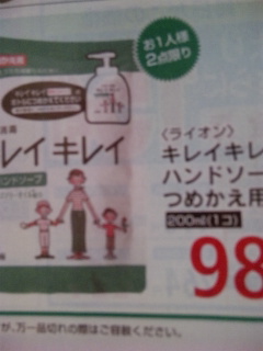 今日のお買い得☆神奈川県相模原版 <ライオン> キレイキレイハンドソープつめかえ用200ml(1 コ) 98円。 Produced by No Name Ninja SEO対策テンプレート