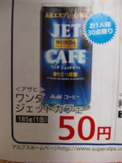 スーパーアルプス城山店にて、アサヒ・ワンダ・ジエットカフェ185g(1缶) 50円!!