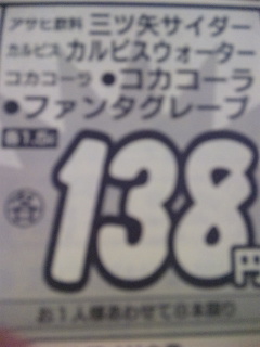 マックスバリュ相模原西橋本店にて、アサヒ飲料・三ツ矢サイダー、カルピス・カルピスウォーター、コカコーラ・コカコーラ、ファンタグレープ各1.5㍑138円!!