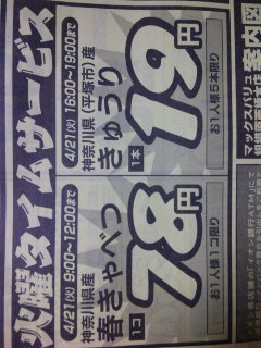 HOME > > [PR] > 食品 > タイムセール!!神奈川県産・春キャベツ 1 コ78円( お一人様1 コ限り)☆神奈川県産・春きゅうり1 本19円( お一人様5 本限り) Admin NewEntry Comment RSS