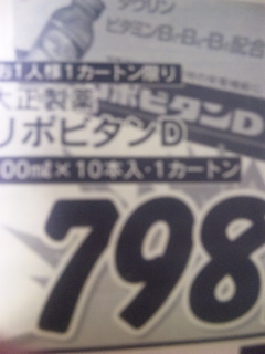 エコス城山店にて、大正製薬リポビタンD(100ml×10本入・1カートン) 798円。