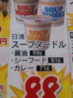 エコス城山店にて、日清・スープヌードル。醤油59g ,シーフード61g,カレー71g 各88円!!