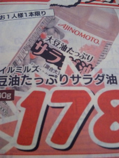マックスバリュ相模原西橋本店にて、Jオイルミルズ 大豆油たっぷりサラダ油1000g 178円!!